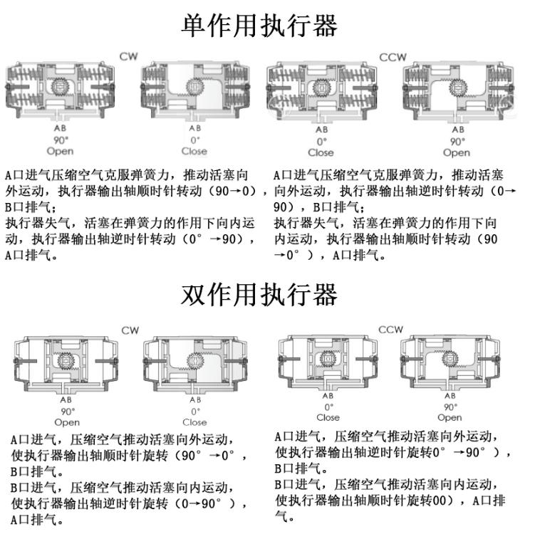 本公司生產(chǎn)的活塞式AT氣動(dòng)執(zhí)行器主要由氣缸、活塞、齒輪軸、端蓋、密封件、螺絲等組成;其中還包括開度指示、行程限位、電磁閥、定位器、氣動(dòng)元件、手動(dòng)機(jī)構(gòu)、信號反饋等部件。具有使用壽命長,抗腐蝕性能強(qiáng)等特點(diǎn)。廣泛運(yùn)用于各行各業(yè)的自控領(lǐng)域之中。